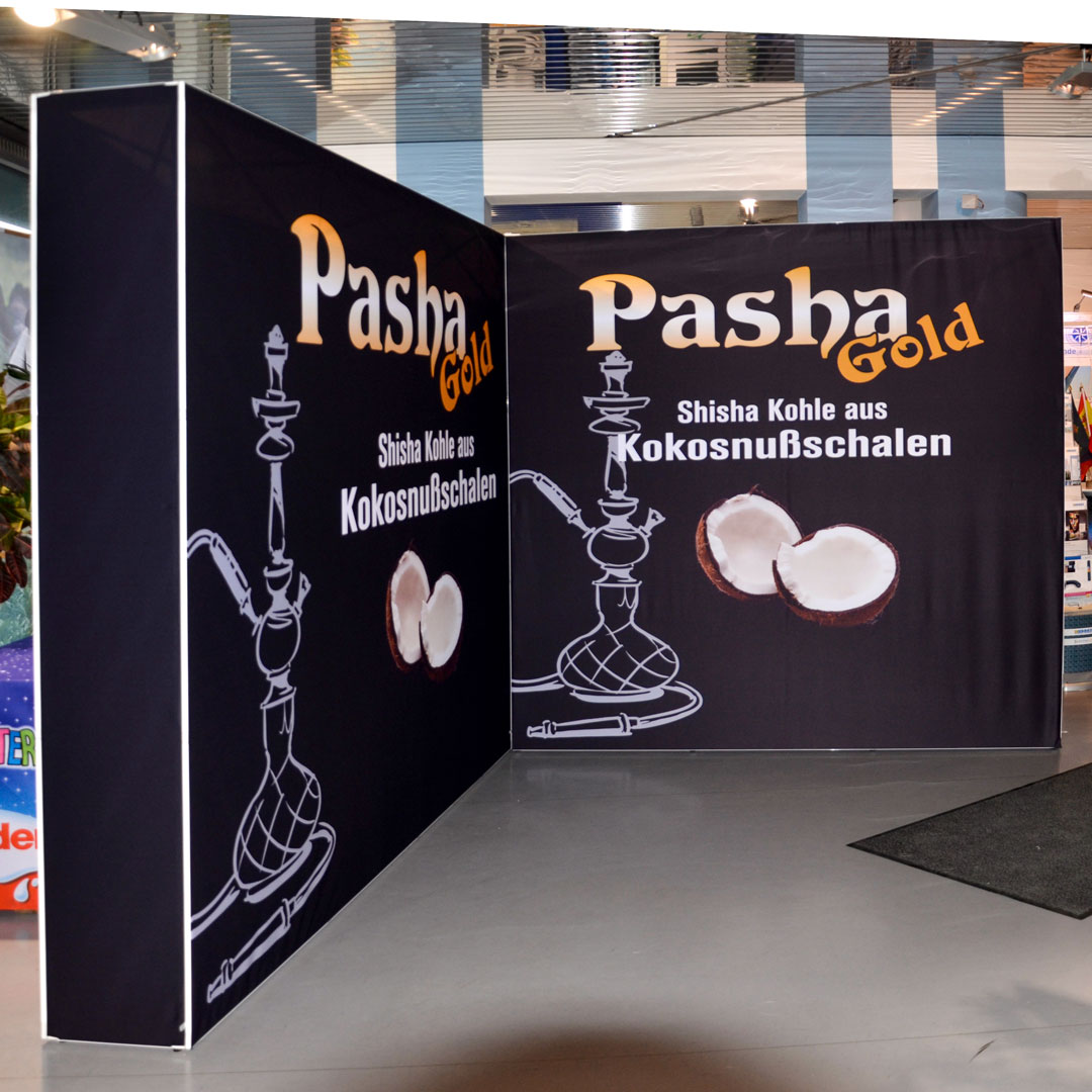 Messefaltwand mit Flachkeder-System und Lightboxbespannungen.