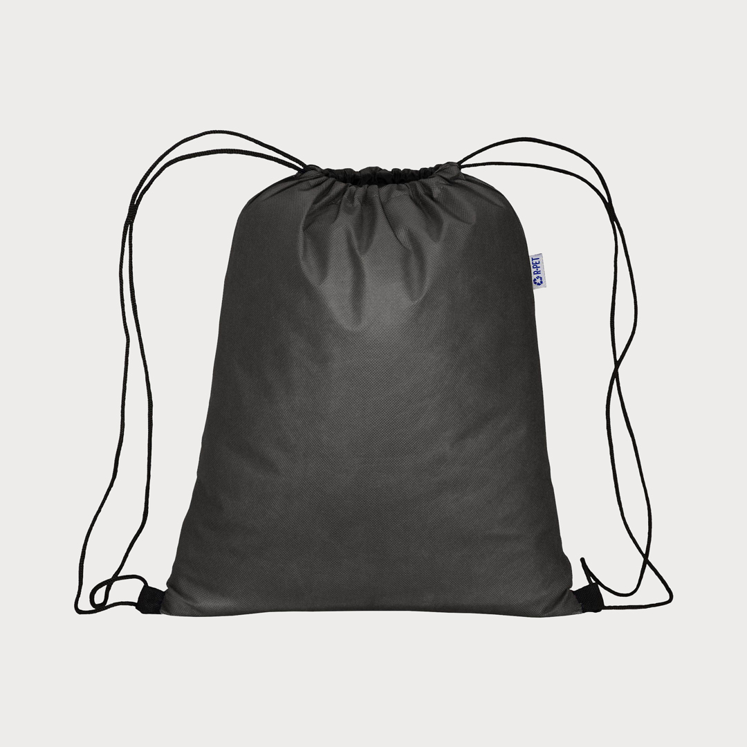 Rucksack aus recyceltem R-pet 70 g/m2 TNT-Material mit Zwickelverschluss. Mit großem Hauptfach und Kordelzugverschluss.
