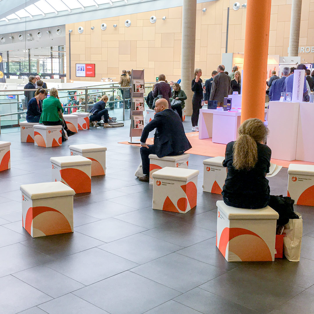 Unsere faltbaren Sitzhocker "BoxSeat®" ersetzen zunehmend die bei Messen und Events als Sitzmöglichkeiten beliebten Schaumstoff Sitzwürfel, da die faltbaren Sitzhocker deutlich einfacher zu transportieren sind und durch den zusätzlichen Stauraum bei Messen und Events auch noch als Aufbewahrungsboxen genutzt werden können. Die Drucke werden über Klettband fest mit dem Falttisch verbunden und ermöglichen so zusätzlich einen problemlosen Austausch.