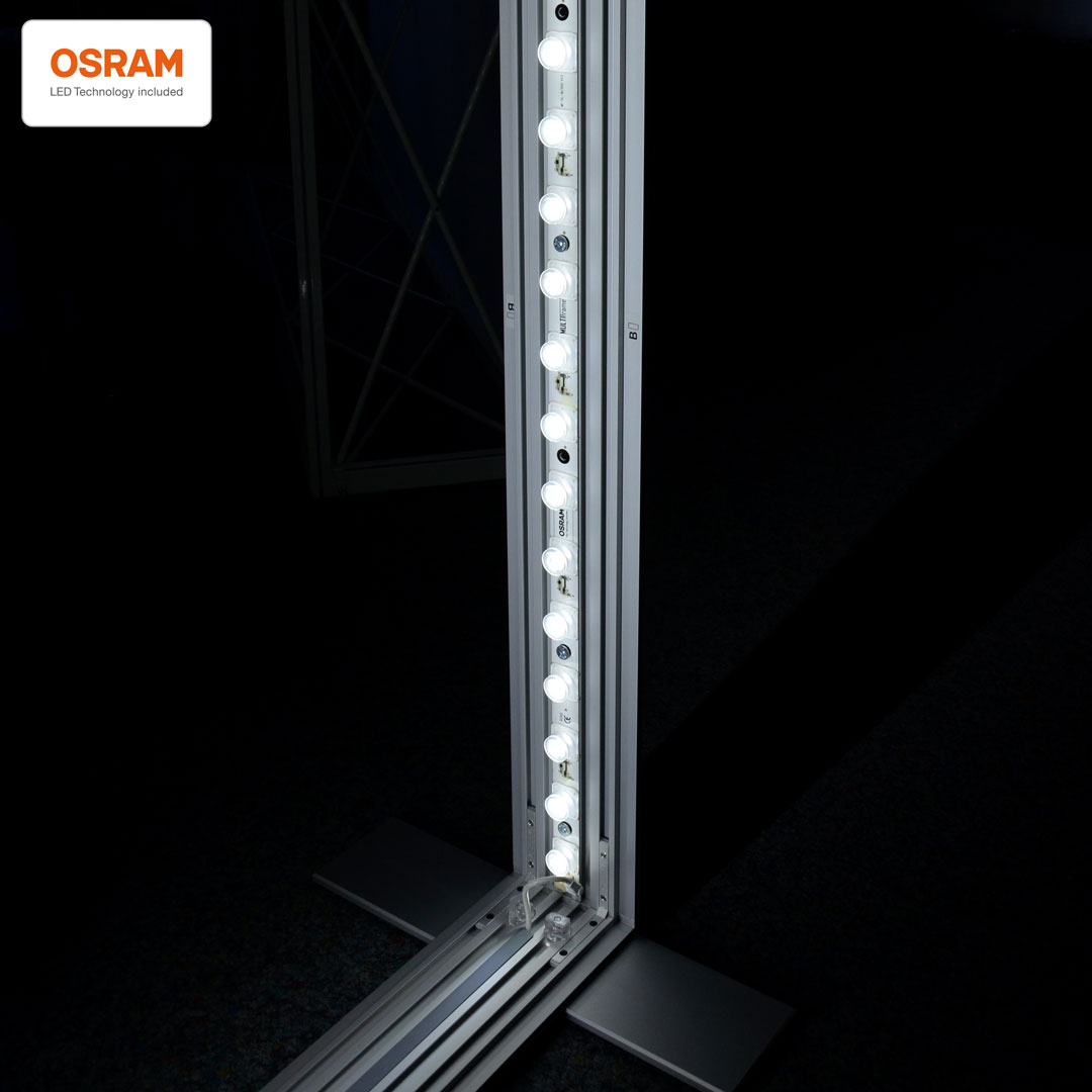 LED UP doppelseitiger Leuchtrahmen aus robustem Aluminium. Schattenfreie Ausleuchtung durch OSRAM LED-Technologie. Mobil und schnell aufgebaut durch cleveres Stecksystem.