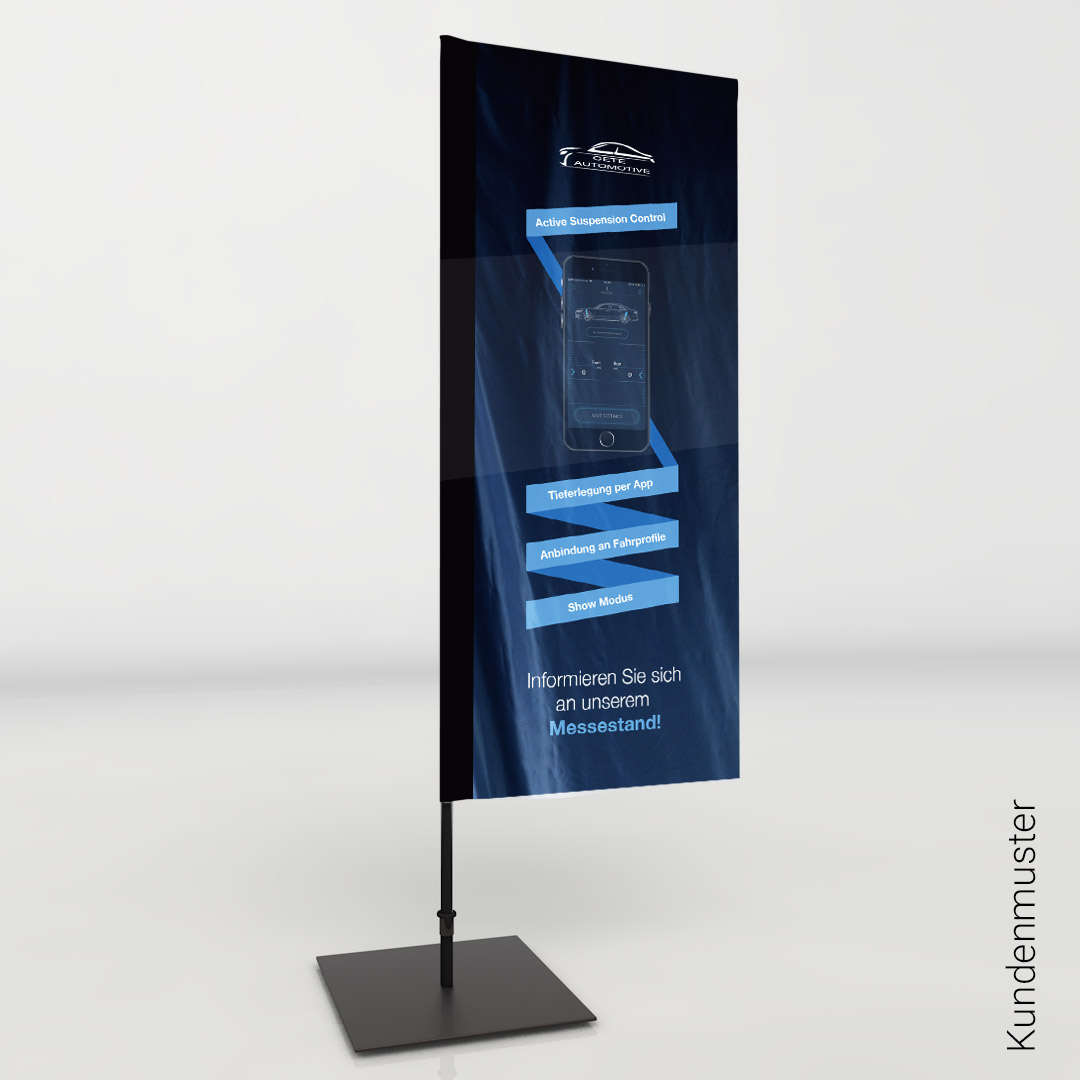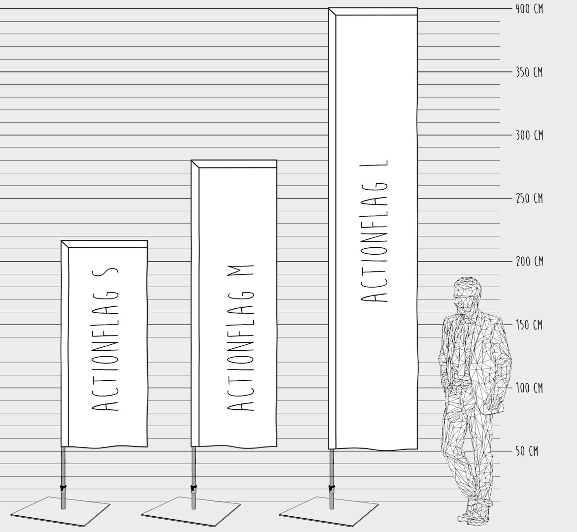 Die ActionFlag ist das fehlende Bindeglied zwischen klassischer Beachflag und mobiler Eventfahne. Unsere ActionFlag ist die Beachflag in klassischer Fahnenform. Sie bietet somit mehr Raum für Ihre Werbung. Im Indoor- und Outdoorbereich zieht sie die Aufmerksamkeit auf Sie - bei Messen, Events und am POS. Wählen Sie aus 3 Größen für Ihren individuellen Einsatzbereich. Da sie sehr leicht ist, ist die ActionFlag besonders gut für den mobilen Einsatz geeignet. Dazu bieten wir die passende Bodenlösung.