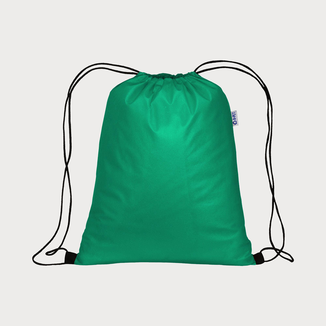 Rucksack aus recyceltem R-pet 70 g/m2 TNT-Material mit Zwickelverschluss. Mit großem Hauptfach und Kordelzugverschluss.